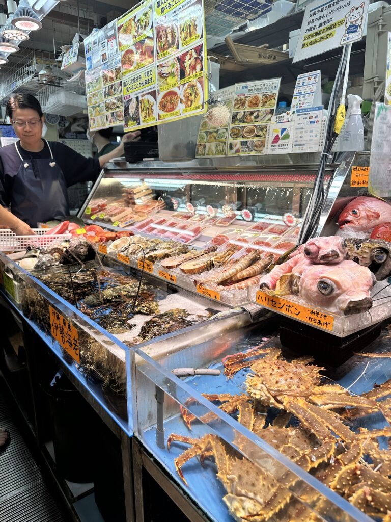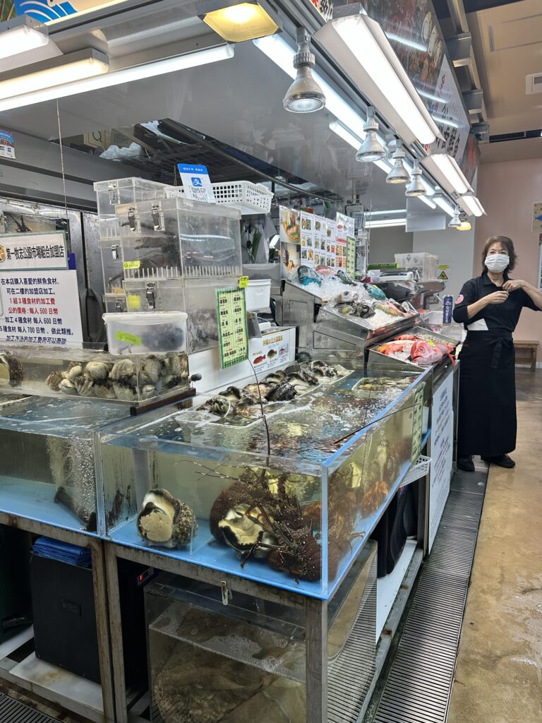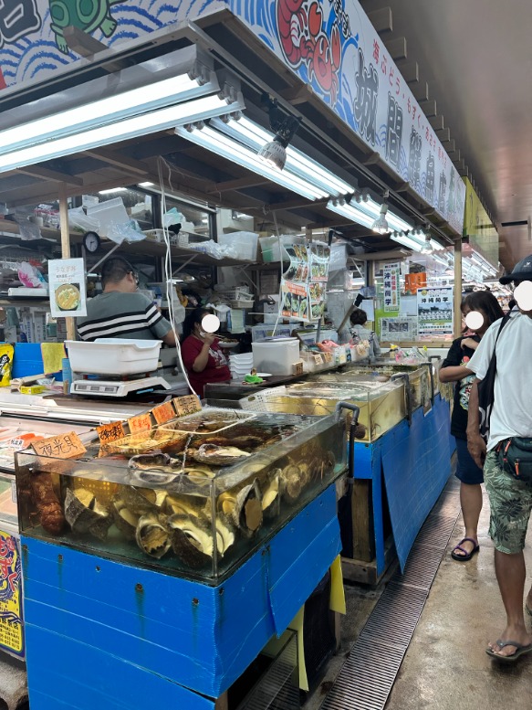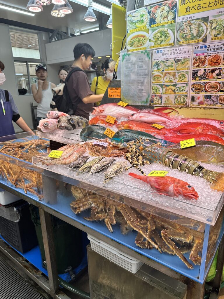 下見していたので、スムーズに一階で魚や貝を注文して、その時に、希望の調理方法も伝え、会計を済まして、スタッフさんと一緒に二階の飲食店へ行きます!